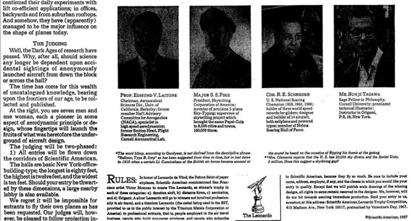 This advert states that the deadline for entries has been extended to 14th February 1967 and announces the panel of eight judges. Note that judge Bunji Tagawa is said to be an 'Instructor in Origami'. The advert states that those entries still in the running after the first stage of tesdting will be tested for aerodynamic qualities in the Princeton Wind Tunnel (although entries in the Origami sections will be spared this test). **********