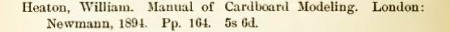 'A Manual of Cardboard Modelling by William Heaton was published by O Newmann and Co in London in 1894. This work is mentioned in 'Bibliography of the Manual Arts' by Arthur Henry Chamberlain, which was published by A Flanagan Company in Chicago and New York in 1902.