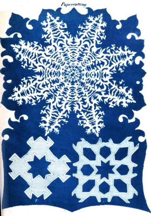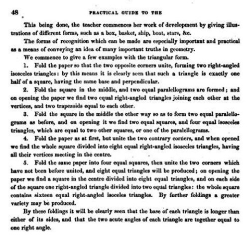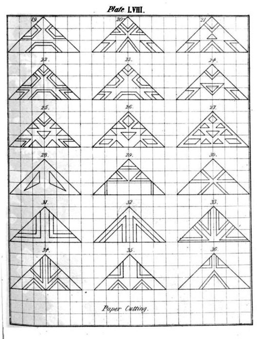 ********** Cutting Paper This section describes how to fold a square of paper into an eight layered right angle isosceles triangle and gives examples of cuts that can be made into this form. It is notable for the sentence: