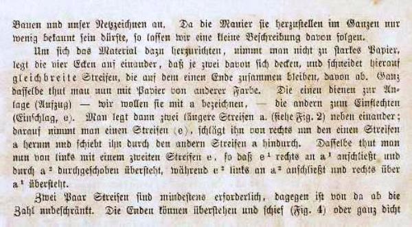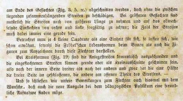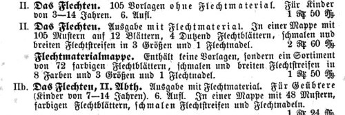 'Arbeitschule Volume 2: Das Flechten: für Kinder von 3 bis 12 Jahren' by Seidel and Schmidt was published by Hermann Bohlau in Weimar. Details of the various versions sold (ie with and without the inclusion of materials) are given in an entry in the Bibliography of the 1874 edition of 'Der Kindergarten in seinen Wesen dargestellt' by August Koehler: