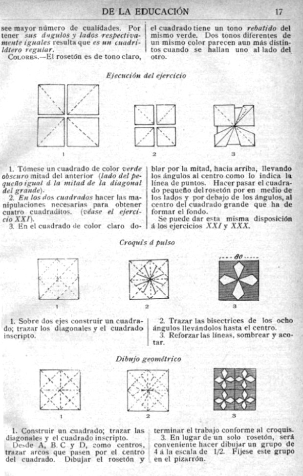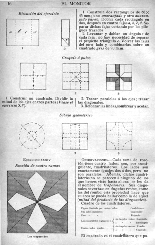 ********** 34 Roseton de cuatra ramos - Four Kites How to fold Four Kites, a square decoration developed from the Windmill Base. A second square is used to create a background to fit around the kites and create a colour change. The text notes that this background can also be applied to the designs made in exercises 21 and 31, the Diagonal Cross and the Interlocking Square.