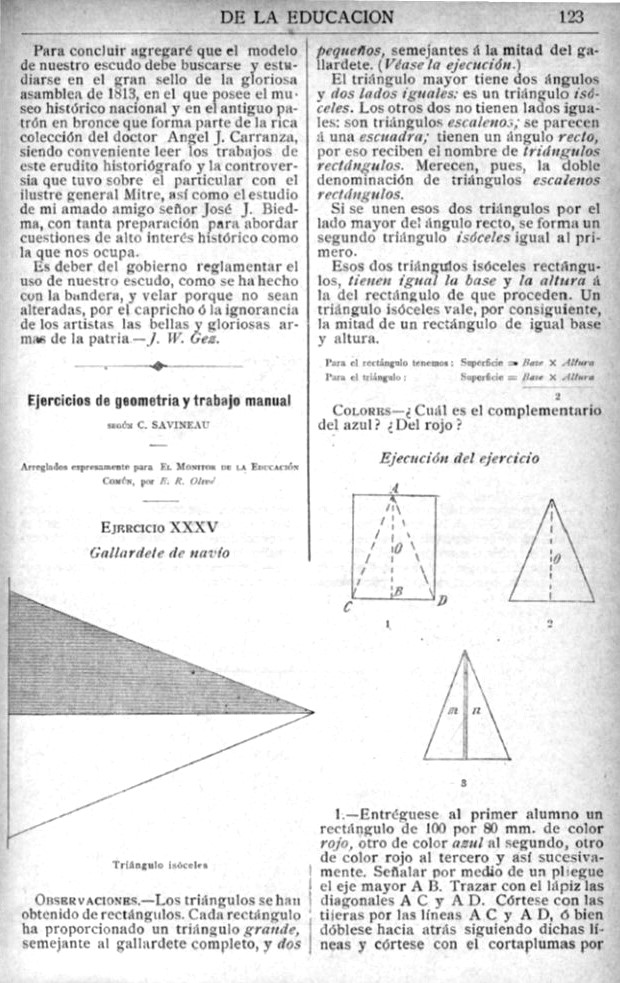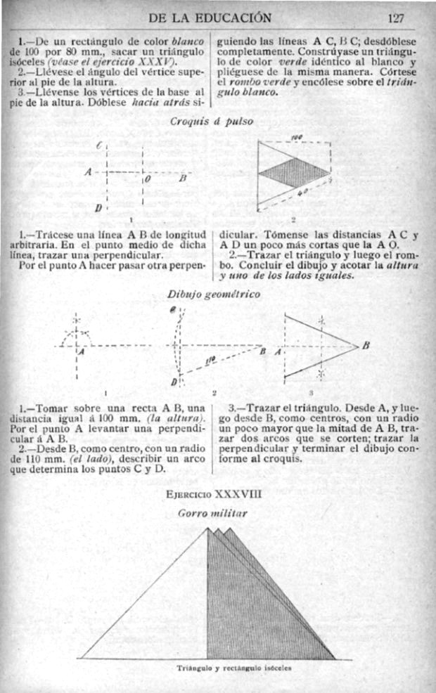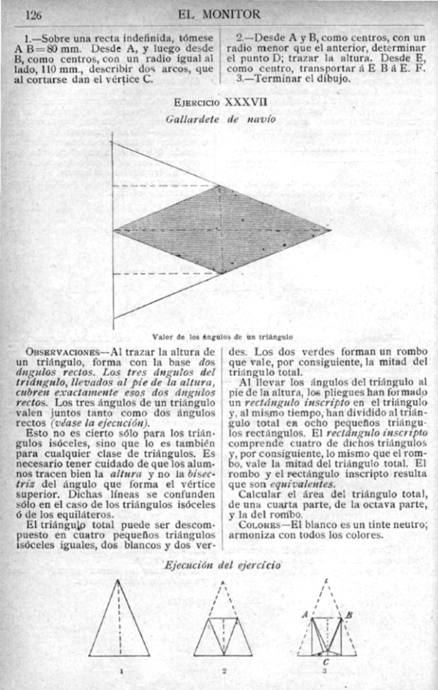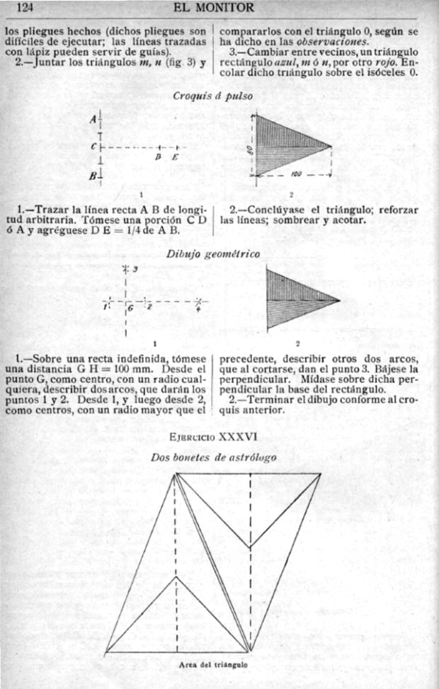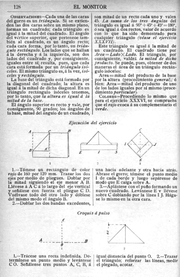 This article is the eleventh in a series of articles which provide a translation into Spanish of 'Pliage et Decoupage du Papier' by C Savineau, which had been published in Paris in 1897. ********** Analysis 35 How to obtain an isosceles triangle from a rectangle. ********** 36 Bonete de astrologo - The Magic Hat This exercise explains how to fold the Magic Hat and uses it as an isosceles tile.