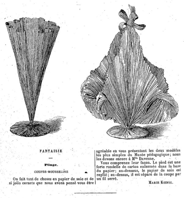 This article explains how to make vases or 'muslin cups' from Crumpled crepe Paper. The bases surround cardboard circles. The same information appears in 'Travaux Recreatifs Pour les Enfants de 4 a 10 Ans' by Marie Koenig, which was published by Librairie Hachette et Cie in Paris in 1898. My grateful thanks for Michel Grand for drawing this article to my attention. **********
