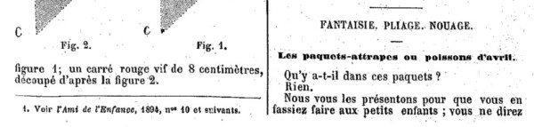 This article expalins how to make Trick Packages or April Fool Gifts intended to look as though they contain (top left) a cream cake, pies, St Honore, an eclair, (top right) feathers, artificial flowers, a ladies hat, (centre) a book, paper or chocolate, (bottom left) a picture, a complement, sheet music and (bottom right) a cone for tobacco, powder, salt or pepper. The same information appears in 'Travaux Recreatifs Pour les Enfants de 4 a 10 Ans' by Marie Koenig, which was published by Librairie Hachette et Cie in Paris in 1898. My grateful thanks for Michel Grand for drawing this article to my attention. **********