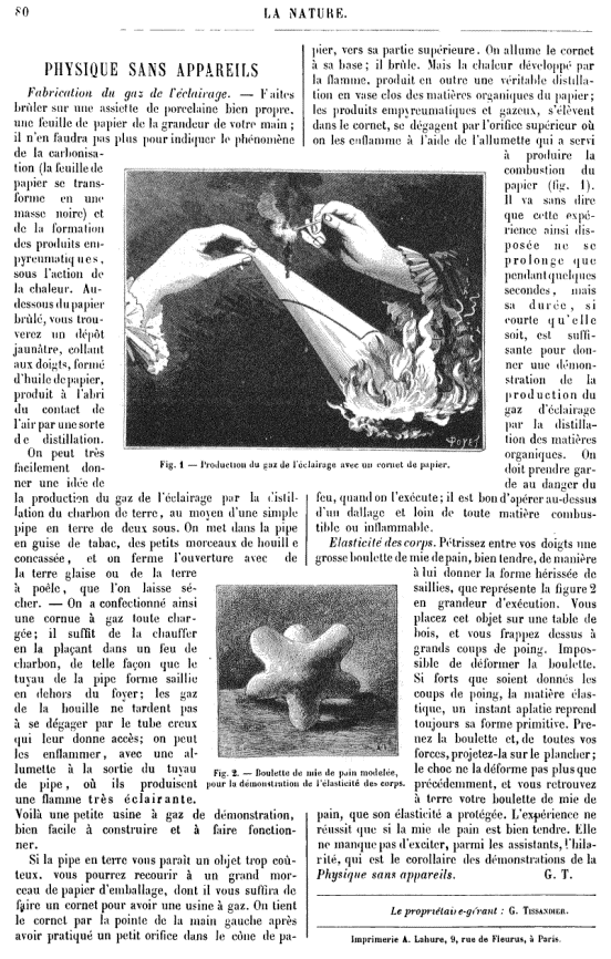This article contains an article headed 'Physique sans appareils' written by Gaston Tissandier which explains how to produce coal gas using a Paper Cone. **********