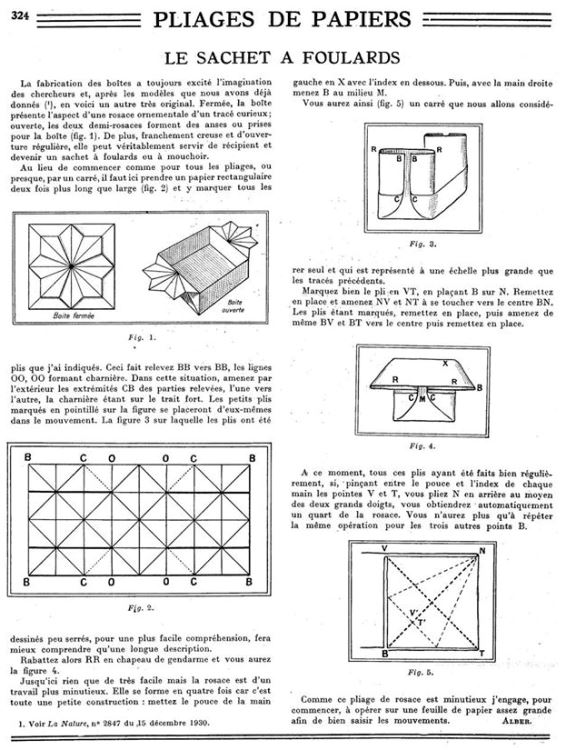 This article by Alber headed 'Pliage de papiers' and subheaded 'Le sachet a foulards' (The Bag for Scarves) explained how to make The Chrysanthemum Box. **********