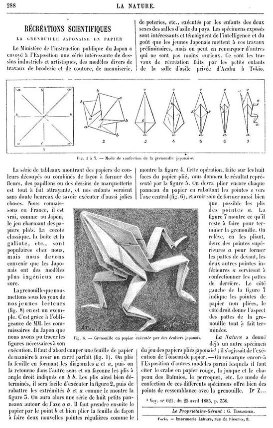 This article headed 'Recreation scientifiques' and subheaded 'La grenouille japonaise en papier' (The Japanese Paper Frog) explains how to make the Inflatable Frog (though the author does not appear to be aware that the frog can be inflated). The article is attributed to 'Dr Z...'. I do not know who used this nom de plume. The article is interesting not only for the diagrams it contains but also for the incidental information it provides. In his introductory paragraphs 'Dr Z...' states, roughly, 'The Ministry of Public Education of Japan has sent to the Exhibition (ie the Paris Exposition Universelle of 1889) an interesting series of industrial and artistic designs ... made by children of both sexes in the country's school rooms ... but one can notice others which are not less curious. These are the recreational works done by the small children of the Azabu private school in Tokyo. The series of displays showing cut out and coloured papers combined to make flowers, butterflies or marquetry designs are quite attractive and our children would probably be happy to know how to make such pretty things. In France, it is true, we also know the charming game of folding paper. The classic Cocotte, the box and the galiote etc., are popular here but we must agree that the Japanese have more ingenious models. The Frog that we put in front of our young readers is an example. It is thanks to MM, the commissioner of Japan, that we have been able to trace the figures necessary for its execution'. At the end 'Dr Z...' adds, again roughly, 'La Nature has previously given another example of the Japanese game of paperfolding, which was how to make the paper bird (ie the Flapping Bird). We also noticed in the exhibition other designs among which were the crab from red paper, the junk (la jonque) and the hat of Daimios (probably a reference to a Daimyo - a Japanese feudal aristocrat), the parrot etc., The way these designs are made has many points of resemblance to the Frog.' Unfortunately there is no way of telling whether the 'crab from red paper' was The Kan No Mado Crab, The Cut Frog-Base Crab or some other design. The hat of Daimios may well be the Kabuto. La Jonque could be the Takarabune. The marquetry designs may possibly be Froebelian Forms of Beauty. However, lacking illustrations, it is not possible to identify any of these designs with certainty. According to Wikipedia Azabu school 'was founded by Soroku Ebara, a Japanese educator in the transitional period of Japan, in 1895. ... It was founded as the middle school at the Toyo Eiwa School but received its new name, Azabu Ordinary Middle School, during the first academic year.' **********