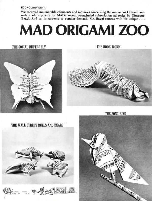 The article 'Mad Origami Zoo of Cliche Creatures' by Giuseppe Baggi appeared in 'Mad Magazine' Issue 129 of September 1969. The designs were folded by, and many were probably also designed by, Giuseppe Baggi, from media appropriate to the title of the design. However: The Wall Street Bulls and Bears designs are 'Longhorn Bull' by George Rhoads and 'Polar Bear Cub' by Samuel Randlett. The Song Bird is by Ligia Montoya. The Road Hog is by George Rhoads. **********