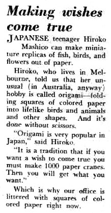 This article in The Australian Women's Weekly of 23rd March 1960. It contains the statement 'And it's done without scissors.' The interpretation of the object of folding 1000 Paper Cranes is also interesting. **********