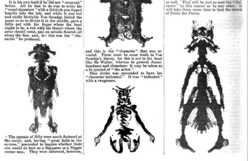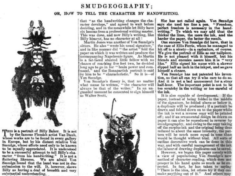 This article explains the art of 'Smudgeography' ie the making of Symmetrical Inkblot figures from signatures. Be advised that one of the sentences contains racially offensive terms. **********