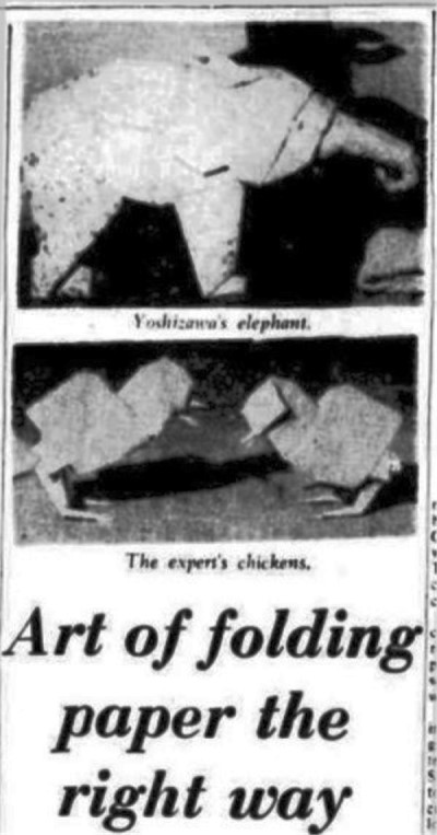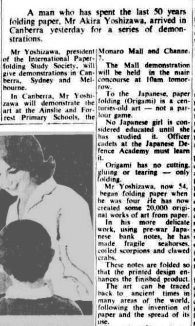 This article is publicity for Yoshizawa's visit to Canberra in February 1966. It states that he will also give demonstrations in Sydney and Melbourne. The article states that 'Origami has no cutting, gluing or tearing - only folding'. It is not clear whether the information in the article came from Yoshizawa himself or a publicity agent acting for the Japanese government. **********