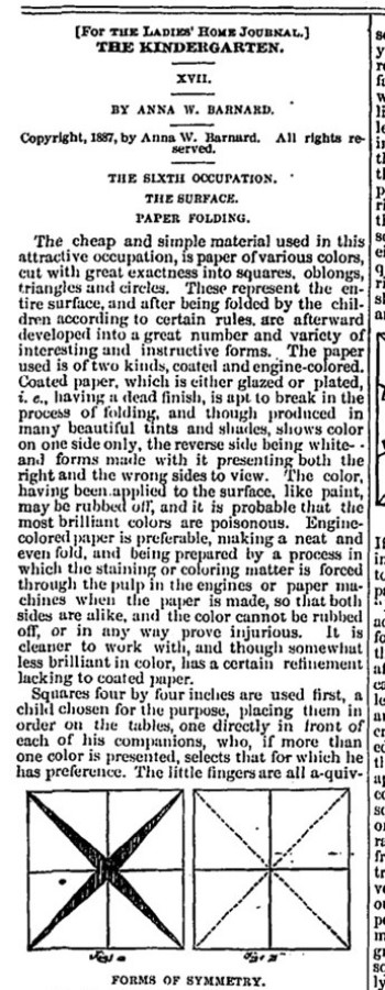 An article entitled 'The Kindergarten: XVIII' and subtitled 'The Sixth Occupation: The Surface: Paper Folding' by Anna W Barnard was published in the issue of 'The Ladies Home Journal' for January 1889. ********** Analysis The article begins with a clear explanation of the difference between 'coated' and 'engine-colored' papers: