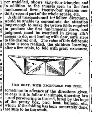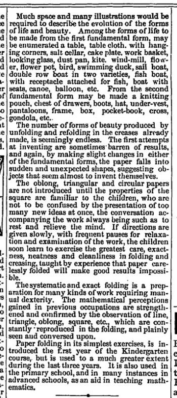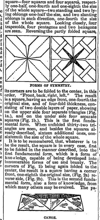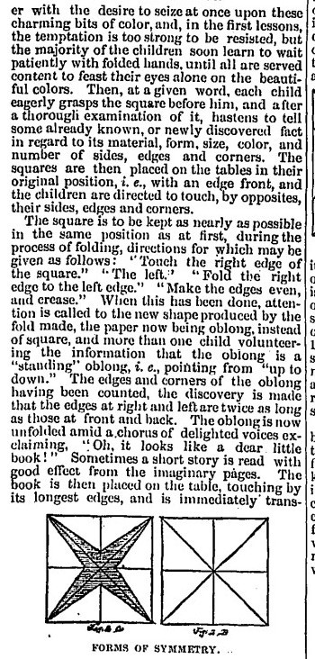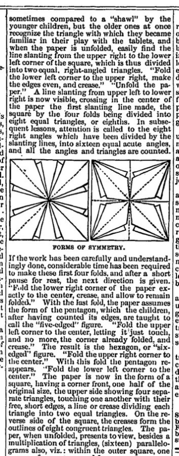 The way in which paperfolding is taught in an American kindergarten at this time is clearly described. Forms of beauty are also referred to as 'forms of symmetry'. Forms of life are also referred to as 'forms of use'. Two list of forms of life are given, one from 'the first fundamental form' (which seems to be a doubly blintzed square ie Froebel's second groundform).