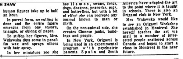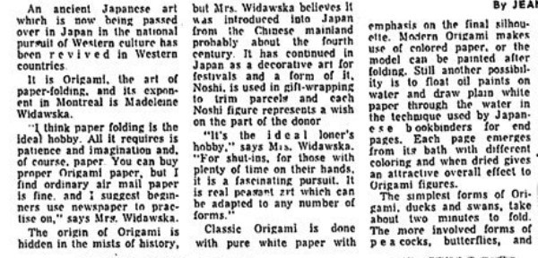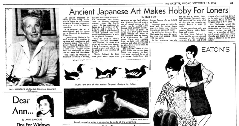 This article is about Madeleine Wadawska and her interest in origami. It includes a photograph of Adolpho's Peacock. **********