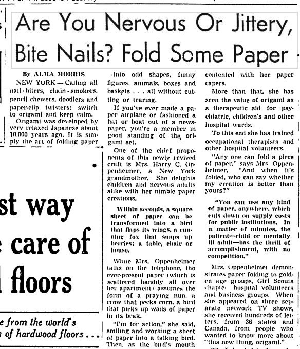 This article is about Lillian Oppenheimer and mentions the formation of the Origami Center. **********
