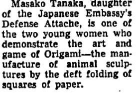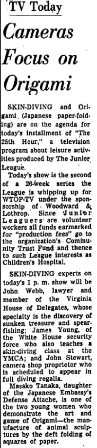 This article is an advert for a television segment on origami on 'The 25th Hour' show on the WTOP-TV channel on 27th September 1959. **********