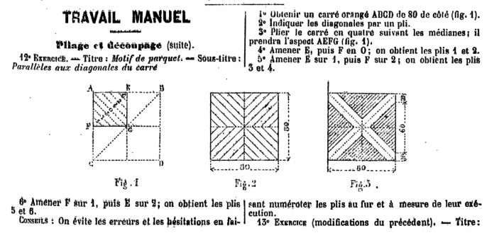 The material from these articles subsequently appeared in 'Pliage et Decoupage du Papier' by C Savineau, which was published in 1897. Information from Michel Grand. ********** Analysis 4th November 1893 This article explains how to fold a square to obtain a crease pattern that has squares of diminishing size in each corner. ********** 18th November 1893 This article explains how to fold a square to obtain the crease pattern of a four-pointed star ********** 25th November 1893 This article explains how to fold a square to obtain a crease pattern that has rightangle isosceles triangles of diminishing side in each quadrant. ********** 4th November 1893