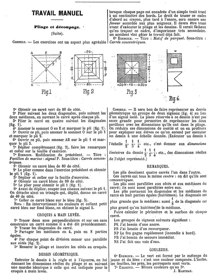 The material from these articles subsequently appeared in 'Pliage et Decoupage du Papier' by C Savineau, which was published in 1897. Information from Michel Grand. ********** Analysis 14th October 1893 This article is about folding the diagonals of the square to create a 'guidon de marine' ********** 21st October 1893 This article is about folding a square into eighths in both directions and using the resulting grid to create a flag. ********** 28th October 1893 This article is about folding a square into a grid of successively smaller concentric squares. ********** 14th October 1893