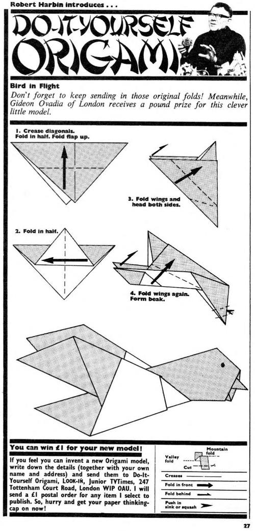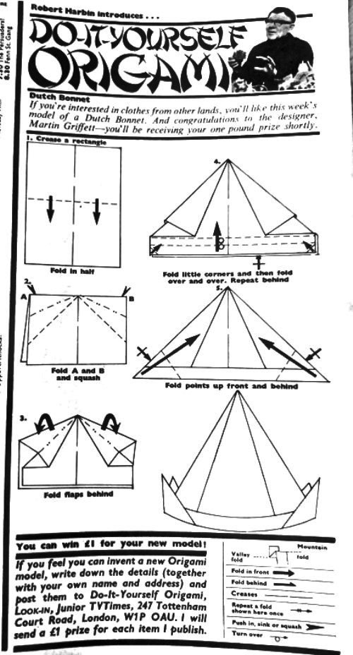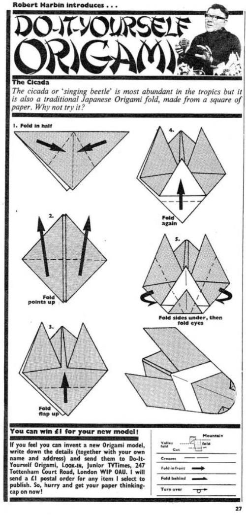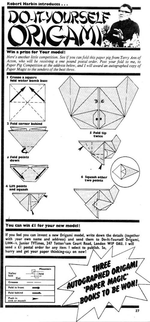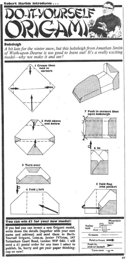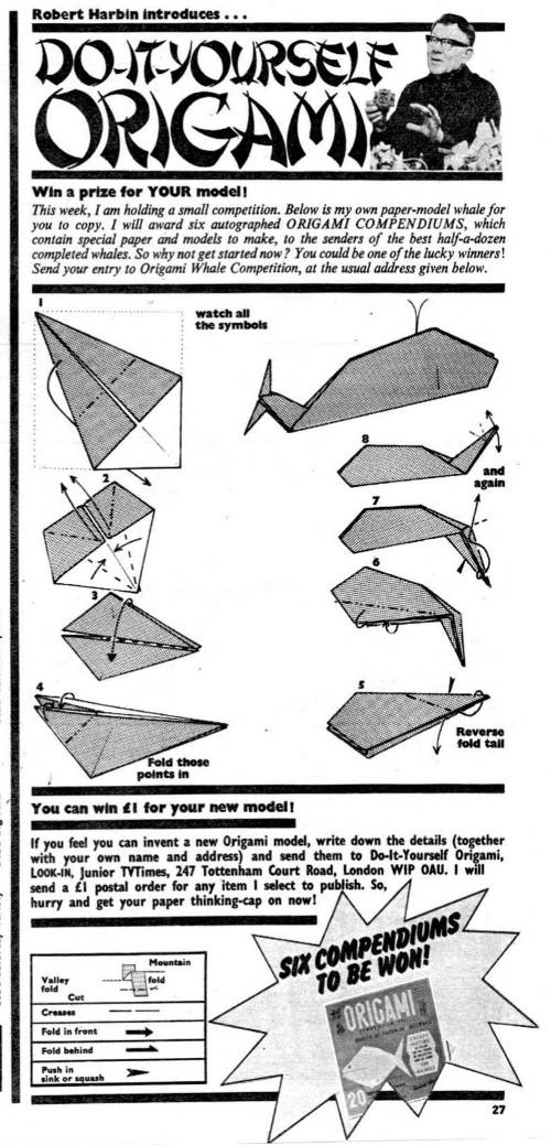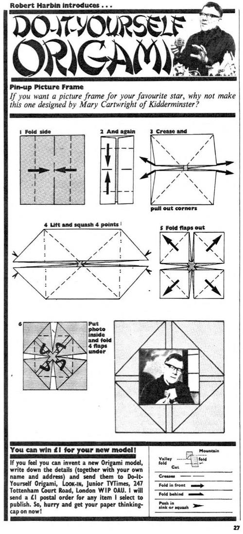 Robert Harbin contributed a series of articles featuring origami designs to ITV's 'Look In' magazine from 1971 onwards. This was a spin-off from his 'Origami' TV program. 'Look In' was first published early in 1971 but I do not know when the first of Harbin's articles appeared, or, indeed, how long they continued to appear for. Many of the designs were sent in by readers, for which they received the princely sum of £1 by Postal Order (as well, of course, as undying fame). Some of these designs were collected together in Harbin's book 'Have Fun with Origami which was published by Severn House in 1975. Thiose few articles I have managed to locate are shown below. ********** From Vol 2 Issue 3 of 15th January 1972 My thanks to Edwin Corrie for providing this one.