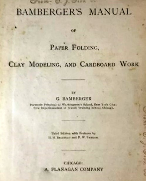 'Bamberger's Manual of Paper Folding, Clay Modeling, and Cardboard Work' by Gabriel Bamberger was published by A Flanagan Company in Chicago in 1895. It is a republication of material from 'Education of Head and Hand' which was published by the same company in 1891 **********