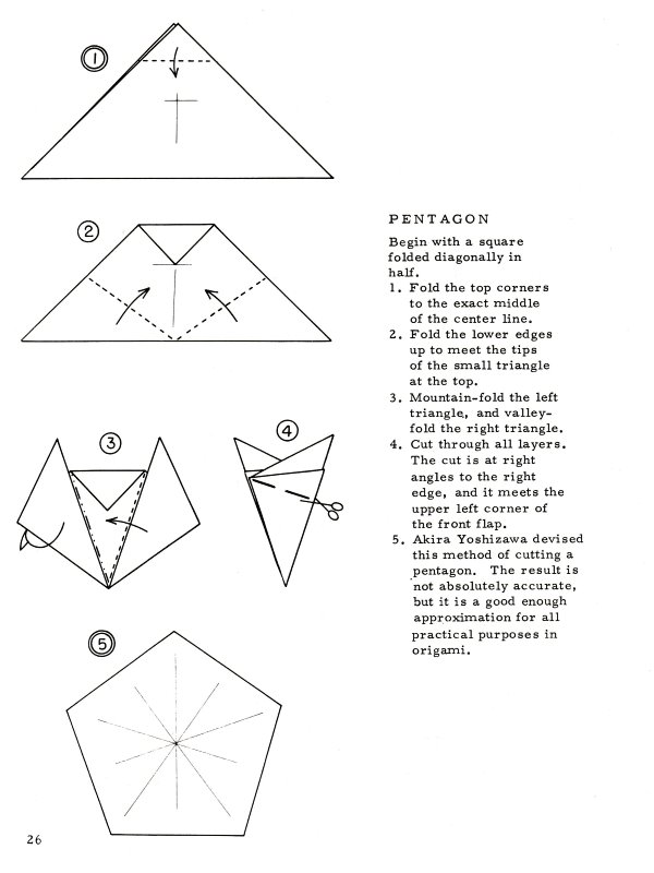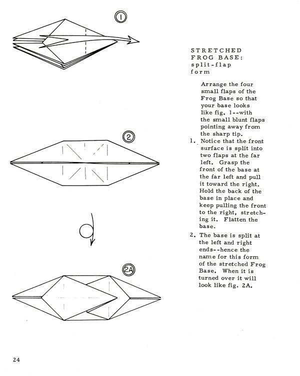 Marshall in Chicago in 1968. There are no diagrams for, or pictures of, paperfolding designs in this work. It sets out a system of standard nomenclature and diagramming symbols for common paperfolding procedures and bases (basic folds) plus ways of making a pentagon and a hexagon with a single cut. (which show that starting from these shapes was still considered a standard part of recreational paperfolding at that time). It is of particular interest because it gives two methods of folding stretched frog bases (the split flap form and the smooth flap form) which are little mentioned ellsewhere. The only blintz base mentioned is the blintzed bird base. **********