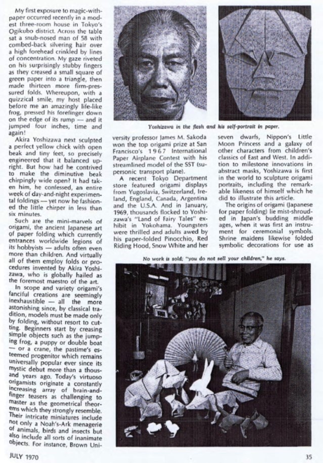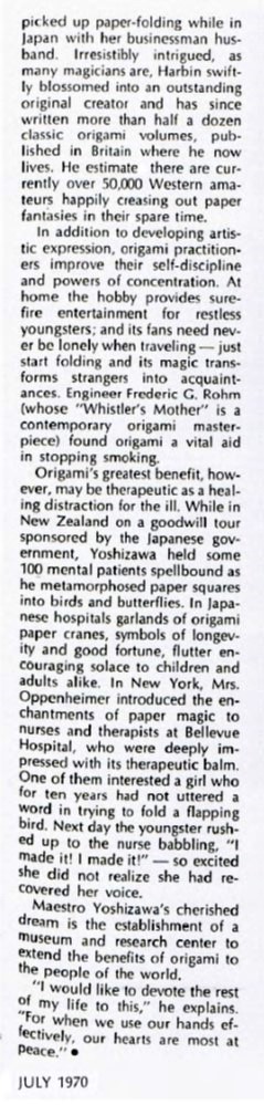 Campbell and Fred Rohm. My thanks to Michael LaFosse and Richard Alexander for sharing their copy of this article with me. According to Wikipedia, Leland Stowe 'won a Pulitzer Prize in 1930 for his coverage of the Reparations Conference in The Hague. Stowe was a runner-up for a second Pulitzer Prize in 1940 for his work as a war correspondent in World War II and his coverage of the Russo-Finnish War.' 'In 1955, he became a professor of journalism at the University of Michigan in Ann Arbor. During his tenure, he alternated between teaching one semester each academic year and working as an editor and staff writer for Reader's Digest.' His article in Beacon Magazine was subsequently republished, in a slightly different form, in the USA version of the August 1970 'Reader's Digest' which claimed to have a worldwide circulation of over 29 million copies in 13 languages. The article was subsequently republished, again in slightly different forms, in the UK edition in October 1970, in the Spanish language edition in November 1970 and in the French and Italian language editions in December 1970. It is quite possible that it was also published in many other languages as well, but I have no evidence of this at present. Since 'Reader's Digest' ostensibly existed to republish work that had previously appeared elsewhere, it is conceivable that Leland Stowe seeded the article in this relatively obscure magazine so that he could then publish it in that much more influential magazine. The sources for the article would seem to have been conversations with Akira Yoshizawa, his mentor Tadasu Iizawa and Lillian Oppenheimer. ********** The initial illustrations show: The origin of the Pegasus is not stated. It is presumably by Yoshizawa. Dove, Nun,and Self-Portrait by Akira Yoshizawa. Whistler's Mother by Fred Rohm. Giraffe by George Rhoads. There is also a smaller photo showing various other Yoshizawa designs (including what seems to be a version of Honda's Peacock). ********** The content of the article can be broken down into the following main sections: Description of a visit to Yoshizawa's home and of watching him fold Some basic historical notes on the origin of origami Biographical detail about Yoshizawa and his relationship with Tadasu Iizawa The creation of Yoshizawa's Cicada (not illustrated) Information about Lillian Oppenheimer and The Origami Center also mentioning Rosalie Evnine, Robert Harbin and Fred Rohm. ********** The article contains some obvious errors: Yoshizawa was not the first to produce a four-legged animal (even from a single sheet). The author seems unaware of the Western influence on Japanese paperfolding through the introduction of kindergarten education Robert Harbin's TV series 'Mr Left and Mr Right' was first broadcast in 1955. It was therefore not 'somewhat later' than the foundation of The Origami Center in 1959. It was Frieda Lourie rather than Lillian Oppenheimer who introduced origami as a therapy at Bellevue Hospital. Origami was not 'virtually unknown in the USA' when Lillian Oppenheimer founded The Origami Center. **********