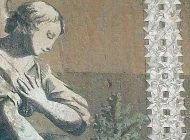 Photographs of this collage were found by Michel Grand on auction sites in 2010 and 2013. The central cross is made from Paper Rosettes, which appear to be interlinked. The other elements appear to have been cut out of printed paper. The name Phillipe Bizot appears at the foot of the collage, the first name on the left and the surname on the right. The date is split in a similar way. The 17 on the left is clear, as is the third digit, another 7, on the right. The fourth digit is difficult to read but appears to me to be a 3. I have therefore used the date of 1773 for this record. I have assumed that Phillipe Bizot was the maker, though I suppose it is also possible that the collage was made as a tribute to him, possibly after his death. I have not been able to locate any information about the particular Phillipe Bizot in question. The dimensions of the collage (including the frame it was sold in) are 40cm x 50cm. By my count the cross is 37 rosettes tall, which means that each individual rosette is tiny, probably between 1cm and 1.5cm square. **********