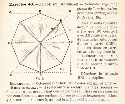 ********** 1887 A method of constructing an octagon using a single cut appears in 'Le Travail Manuel a L'ecole Primaire' by M. Coste et J. Lapassade, which was published by Lafon, Vve Ribaut et Tonnet in Pau and A Jeande in Paris in 1887.