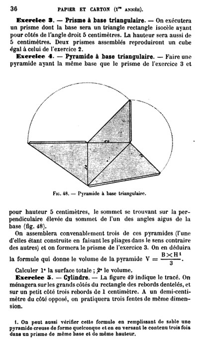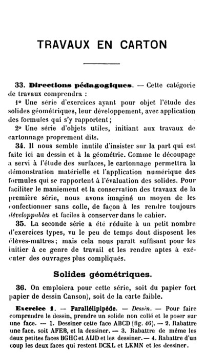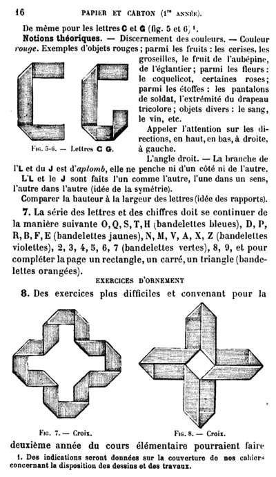The Third Revised Edition of 'Cours Normal de Travail Manuel' by P Martin was published by Armand Colin et ces Editeurs in Paris in 1894. It contains considerable paperfolding material which did not appear in the first edition. Inter alia the Preface states: 'it seems that the period of trial and error, through which all new things pass, is over with regard to manual education. It has been recognised that it is neither possible nor desirable for all elementary schools to be equipped with a workshop for iron and wood. In 1891 a commission established to prepare a curriculum for teaching manual work in the primary schools of Paris clearly distinguished between schools without workshops and schools equipped with one. It developed for the former a complete program in which the handling of paper, cardboard, wire etc gives rise to a sufficient number of educational exercises, with a progression easily established ... ' and '... a decree of the Minister of Public Instruction dated January 3rd 1891 ... modified the programs of normal schools ...' accordingly. A copy of this decree was included at the end of the Preface (and is reproduced below). It provides for the first year of teaching to include: 'Weaving, folding, cutting and cardboard work related to the teaching of drawing, geometric shapes, and arithmetic' as well as 'Binding and boxing a book'. Details of the first edition can be found here. A full copy of the third edition can be accessed online here. **********