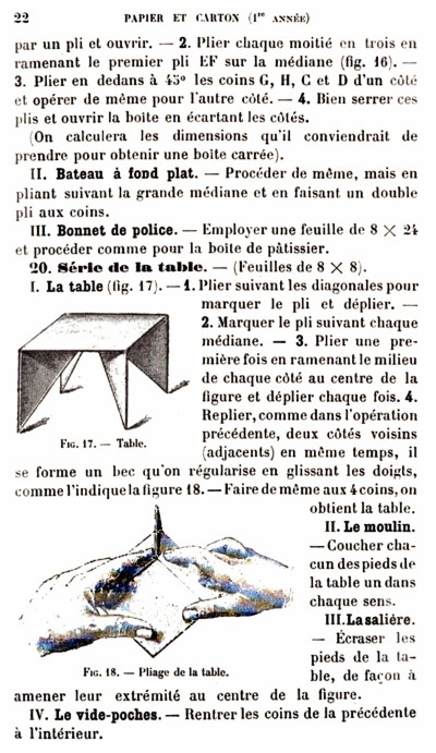 ********** Bateau a fond plat No illustration of finished fold but by comparison with 'L'annee preparatoire' clearly The Flat Bottomed Boat ********** Bonnet de police No illustration of finished fold but by comparison with 'L'annee preparatoire' clearly The Pattiserie Box Hat ********** La table - The Table