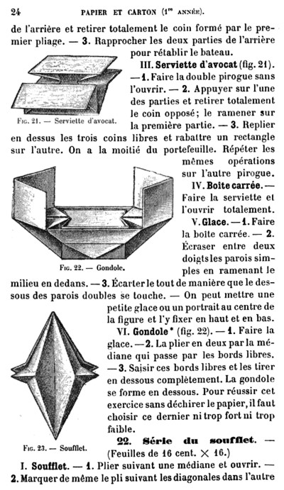 ********** Pliage du papier Footnote 1 on p20 says that: 'The following summary instructions are only a kind or rerminder ; the full explanation will be found in our L'Annee prepatoire de travail manuel.' Where no illustration is given I have therefore relied on that earlier work to identify the design. Chapeau de gendarme - The Newspaper Hat