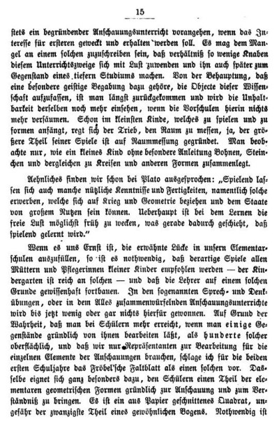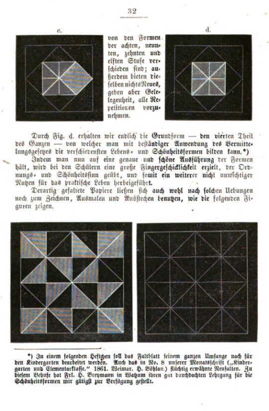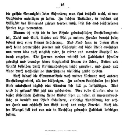 ********** The Introduction is mainly a long discussion of pedagogy without specific reference to paperfolding, but on page 15 he says, roughly translated, 'Based on the truth that one achieves more with students by having them work on a few objects thoroughly rather than hundreds of them superficially ... I propose the (use of the) Froebel leaflet for the first two school years. It is particularly suitable for giving students a thorough visualisation and understanding of some of the elementary geometric shapes. It is a square cut out of paper, approximately one twentieth the size of an ordinary sheet' and goes on on page 16 to set out the advantages he feels creating geometrical forms by paperfolding has over copying them from a blackboard.