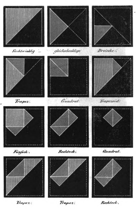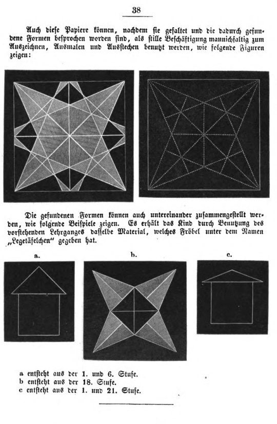 ********** Page 38 explains how a crease patterns created using 22.5 degree creases can also be used for tracing, colouring and cutting out. The second paragraph says, roughly, 'As the following examples show, the shapes can also be arranged one below the other. By using the above course of studsy, the child receives the same material that Froebel presented under the name 'Legetafelchen' (laying boards)'.