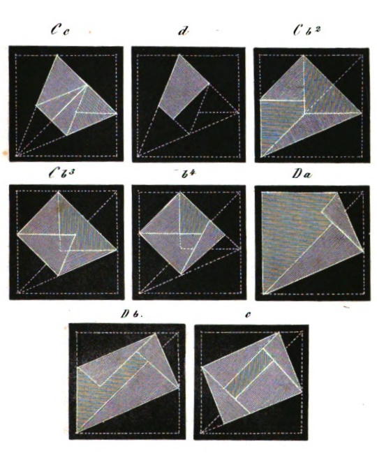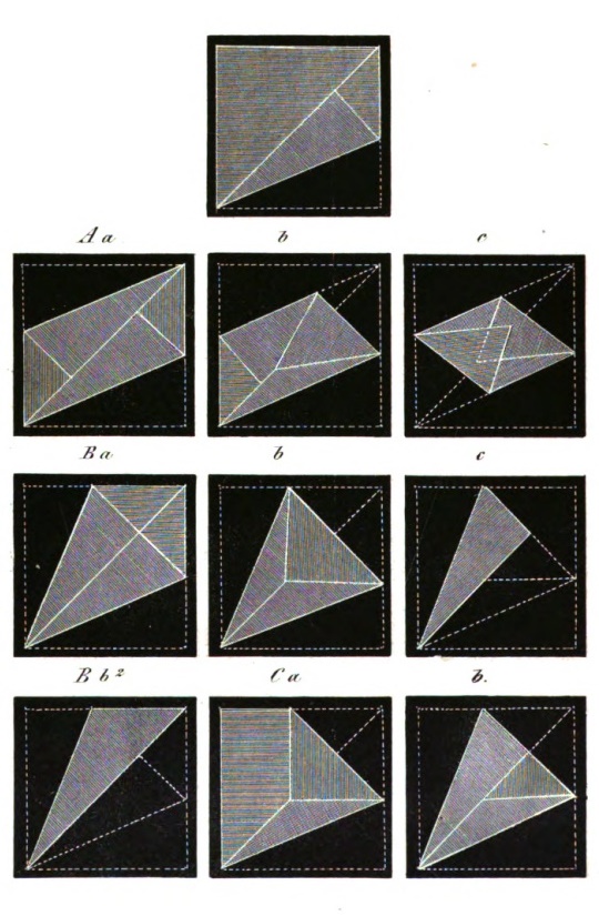paper. The work is a guide to the use of a series of very simple paperfolds intended to be used to teach geometrical ideas in the elementary class (ie the two years above kindergarten). The work extends the range of Froebel's original Folds of Knowledge by showing how the square can be folded into other geometrical shapes, in particular using folds of 22.5, 30, and 60 degrees. A full copy of the work can be accessed online here. A second 'expanded and improved' edition was issued in 1872. **********