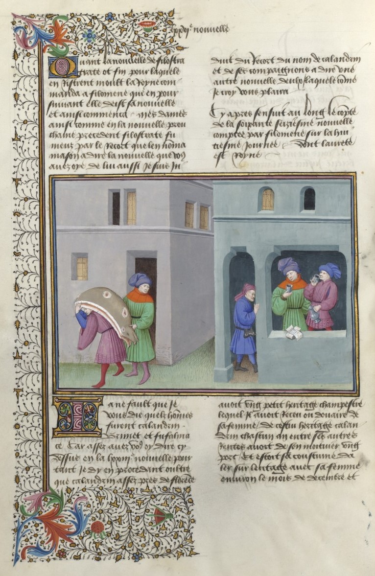 This version of Boccaccio's 'Decameron' is a translation into Flemish by Laurent de Premierfait said to be dateable to 1432. It contains an illustration showing a box which appears to have been made by folding a sheet of either paper or parchment. As far as I know this picture was first drawn to the attention of the paperfolding world in a letter from Barbara Benson of Atlanta Georgia (aka Donna Serena de Riva) to David Lister, see https://www.yumpu.com/en/document/read/11546606/paper-folding-in-15th-century-europe-welcome-to-my-website-it- **********
