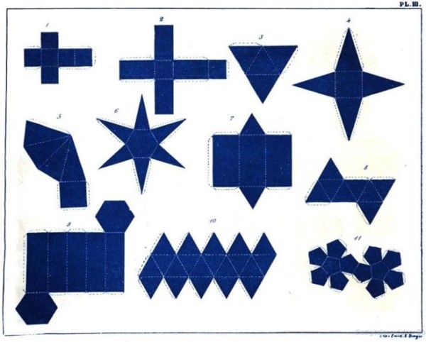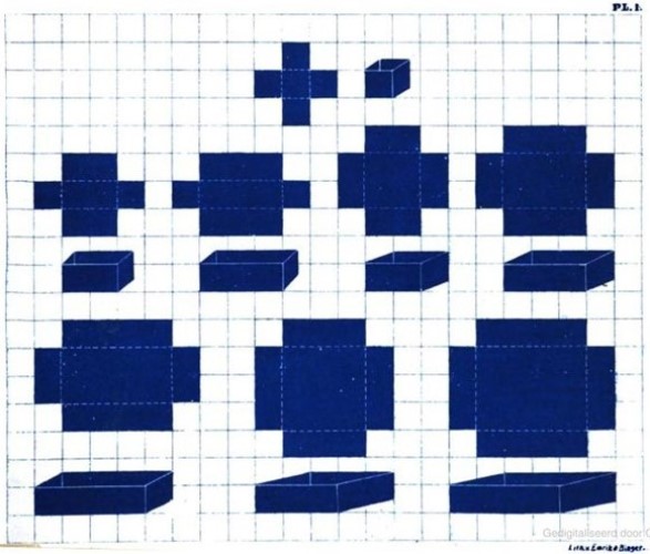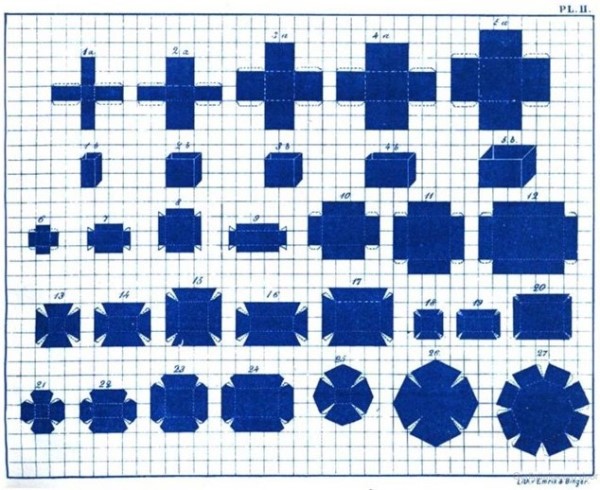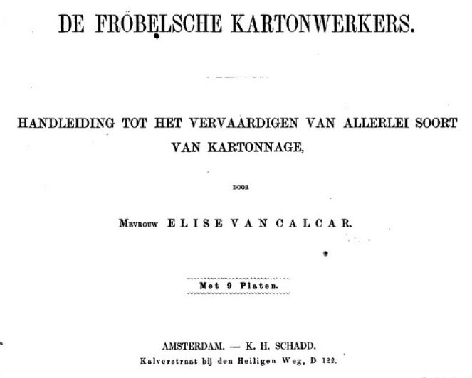 'De Frobelsche Kartonwerkers' by Elise Van Calcar was published by K H Schadd in Amsterdam. The work is undated but said to date from 1865. It is a manual of cardboard modelling designs. No explanation is given for the title or as to why Froebel and Cardboard Modelling should be linked in this way. The designs are for: Furniture / Buildings / Boxes / Polyhedra. A full copy of the work can be accessed online here. **********