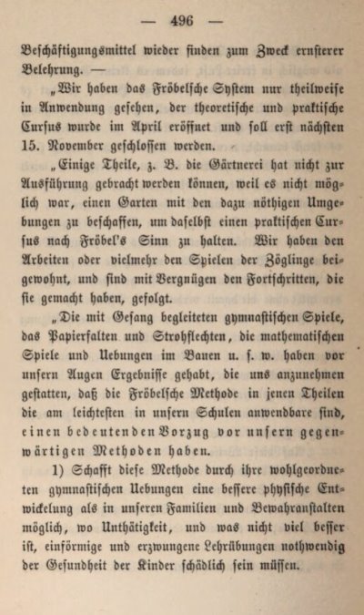 'Die Arbeit und die neue Erziehung nach Froebel's Methode' (Work and the new education according to Froebel's method) by Bertha von Marenholz-Bulow was published by Adolph Enslin in Berlin in 1866. It provides information about Froebel's Intermediate Class and contains a sample lesson in paperfolding taken from Koehler's 'Das Frobel'sche Faltblatt' as an example of good practice. The Foreword states that the work was complete in 1864 but publication had to be postponed pending the obtaining of permission to publish some of the correspondence. The work contains a section about Froebel's Intermediate Class (a transition between kindergarten and trade school),