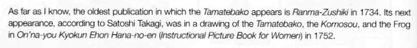 A copy of the drawing was not included in the book and no mention was made of the name of the artist. However, Kasahara also mentioned what I believe must be the same print in his 'New Discoveries in Origami 3', published in 2005, where he did include a copy of the print (albeit a poor reproduction) and an attribution, to Nishikawa Suketada. His commentary reads: 'By the way, please look at the figure on the next page. The document is a little damaged and difficult to read, but in the middle of the three girls, in the circle shown, there are five other things drawn: a frog, a paper crane, a cargo boat, a komuso monk, and a treasure box. It is very interesting. The document in which this picture was published is called "Lessons for Women: Ehon Hana no Utage" (painted by Nishikawa Suketada, 1752), which I learned about through the introduction of Takagi Satoshi. Now, what is extremely interesting here is the bottom "Tama-te-bako", and as far as we can see from this diagram, "only the top surface is assembled!" If we consider this diagram to be accurate, this is probably a "one-piece Tama-te-bako"!' ********** |