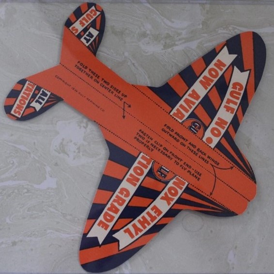 This paper aeroplane design was distributed by the Gulf Refining Co in 1934 as an advertising novelty. The date can be seen on the detail below.