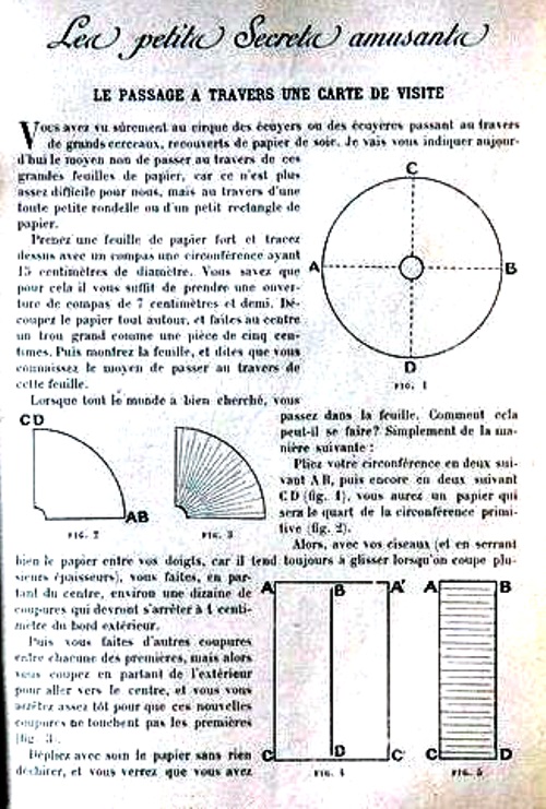 ********** 1908 In two forms, from a circle folded into quarters and a carte de visite folded in half, under the title 'Moyen de passer au travers d'une carte de visite', in 'Les Petits Secrets Amusants' by Alber-Graves, which was published by Librairie Hachette in Paris in 1908.