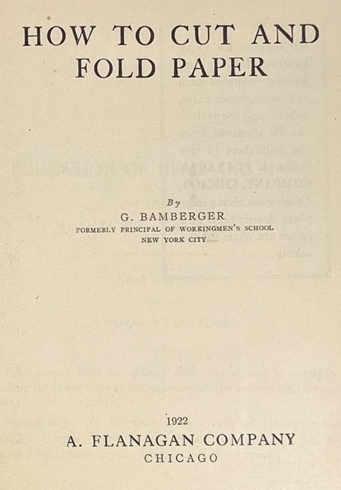 'How to Cut and Fold Paper' by Gabriel Bamberger was published by A Flanagan Company in Chicago in 1922. It is a republication of the material from Leaflet 1 of 'Education of Head and Hand' which was published by the same company in 1891. **********