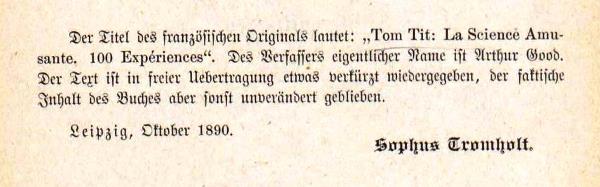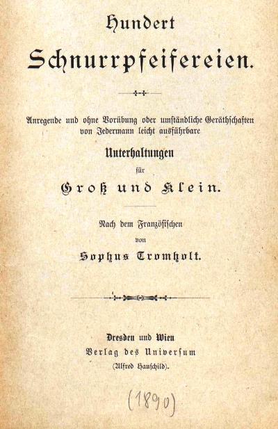 'Hundert Schnurrpfeifereien: anregende und ohne Vorübung oder umständliche Geräthschaften von Jedermann leicht ausführbare Unterhaltungen für Groß und Klein'' by Sophus Tromholt was published by Verlag des Universum in Dresden and Vienna in 1891. It is a free translation into German of 'La Science Amusante' by Tom Tit.