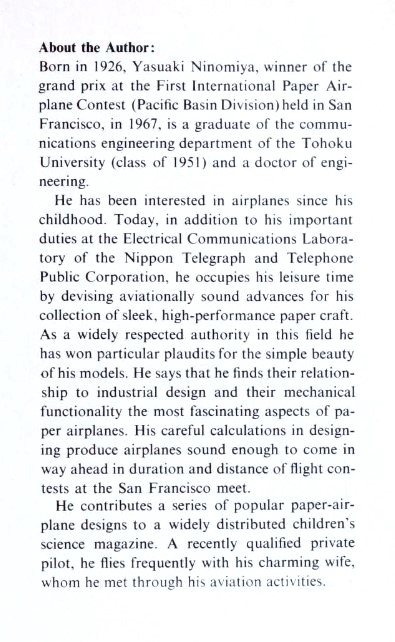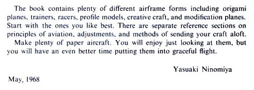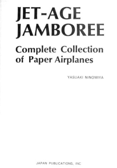 'Jet-Age Jamboree' by Yasuaki Ninomiya was published by Japan Publications in Tokyo in 1968. It is fundamentally a book of cut-out-and-glue-together designs for model aircraft but does include two sets of diagrams for paper planes (which the author calls 'origami planes'). A full copy of the work can be accessed online here. The information about the author states that he won both the duration aloft and distance contests at the 'First International Paper Aircraft Contest (Pacific Basin Division) held in San Francisco in 1967.