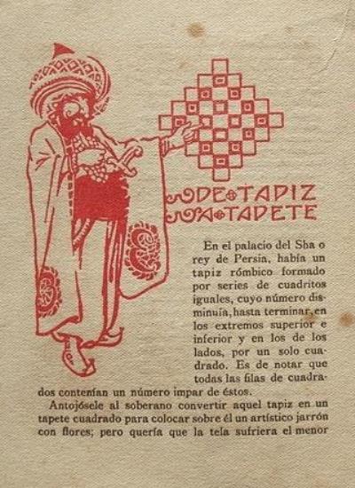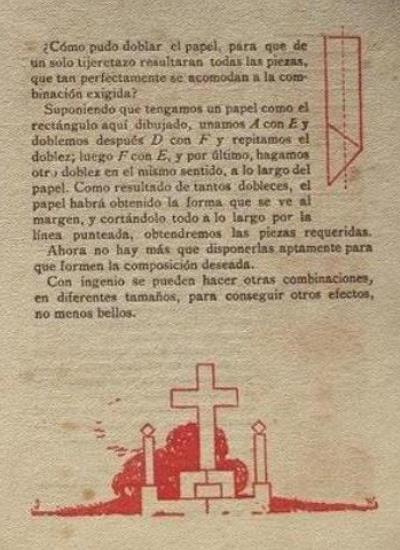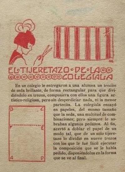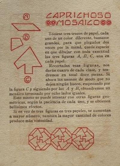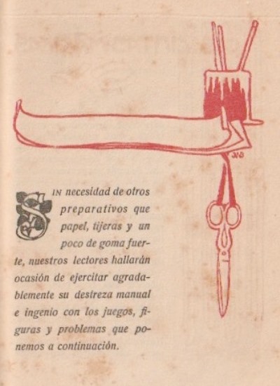 'Pasatiempos: Juegos Figuras Problemas Con Papel y Tigeras' (Games, Figures, Problems with Paper, Scissors) was published by Editorial Muntanola in Barcelona. The work is undated but was probably published c1918. A full copy of the work is given at the foot of this page. **********