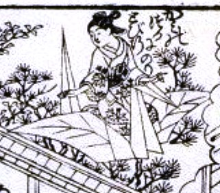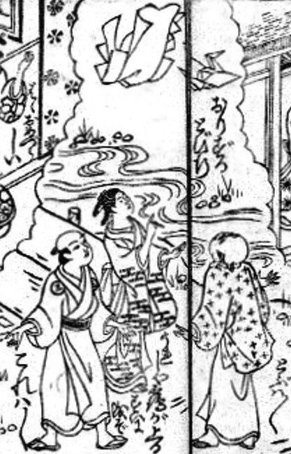 'Keisei ori tsuru' was published in 1717. The author of the work is unknown. It contains prints which show Paper Cranes and Komoso. Source: 'Oru Kokoro', the catalogue of an exhibition on paperfolding history held in Tatsuno City History and Culture Museum in 1999. I have not been able to find a copy of this work online. ********** In this picture a child studying in a terakoya (a school for the children of commoners) is writing a poem on the wing of a Paper Crane, while another Paper Crane and Komoso rest on a tabletop nearby (see detail). In the centre three figures look upwards at another Paper Crane flying above their heads.
