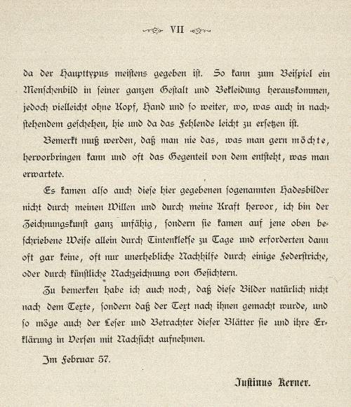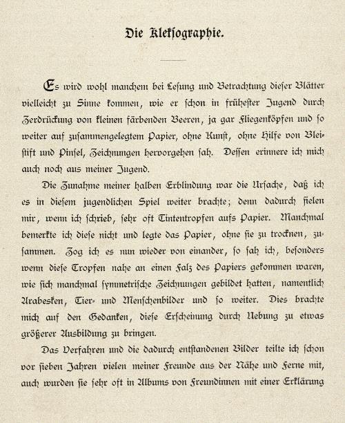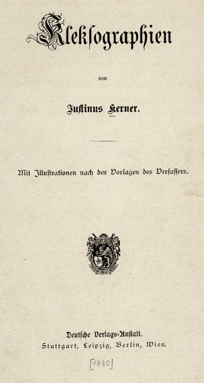 'Klecksographien' by Justinus Kerner is undated, but said to have been published in 1890, some years after his death. The author's introduction is dated 1857, and the work seems therefore to have been complete, although unpublished, at this date. Each symmetrical inkblot picture in the book is accompanied by a poem inspired by the image. In his introduction the author says, roughly translated: ''When reading and looking at these pages, many people will remember how, even in their earliest youth, they saw drawings emerge from the crushing of small berries, or even fly-heads etc, on folded paper, without art, without the help of pencil or brush. ... The fact that I was half-blind was the reason I was able to progress in this youthful game; because of this, drops of ink often fell onto the paper while I was writing. Sometimes I didn't notice them and just folded the paper together without drying them. When I pulled it apart again, I saw, especially when those drops had come close to a fold of the paper, how sometimes symmetric drawings had formed, namely arabesques, animal and human images and so on. This gave me the idea of developing the phenomenon. Later he says that some of the inkblots have been enhanced with additional lines to credate faces etc. The complete work can be accessed on-line here. **********