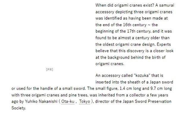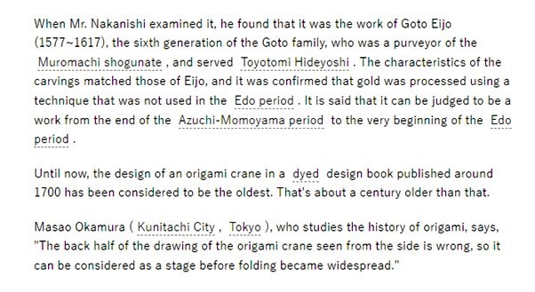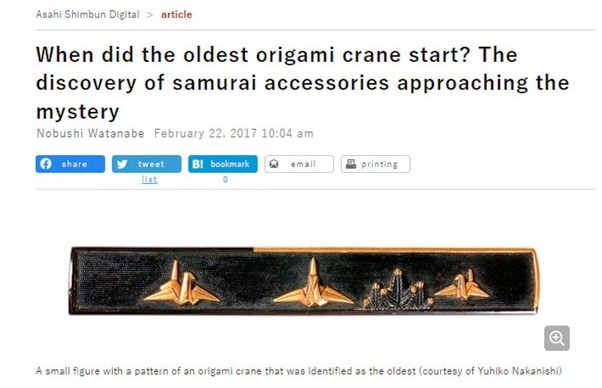 According to an article in the Asahi Shimbun Digital of February 22nd 2017, the oldest known representations of the Orizuru have been found on a kozuka which can be dated to around 1600. Masatsugu Tsutsumi has since informed me that this has been narrowed down to 1591/3. I have not seen any other evidence to support the dating of this artifact. ********** This version of the article has been automatically translated from the original Japanese. The original can be found online here.