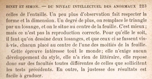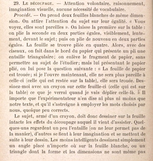 'L'Annee Psychologique: Onzieme Annee' was published by Alfred Binet in Paris in 1905. It contains an article written by Binet and Simon which describes various psychological tersts, one of which is to visualise the result of making two cuts in folded sheet of paper. The two cuts remove a triangle from a folded edge. When unfolded the triangles become two lozenges, one either side of a centre line. **********
