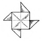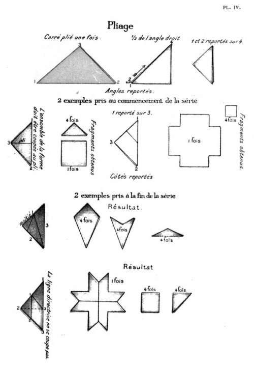 ********** Plate IV shows two examples of designs that can be cut from a square folded diagonally in half twice using just one cut, then two ways of using two cuts to separate the paper into pieces of several shapes.