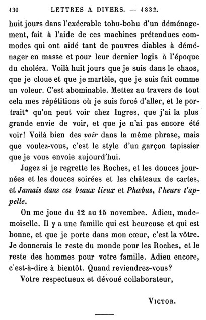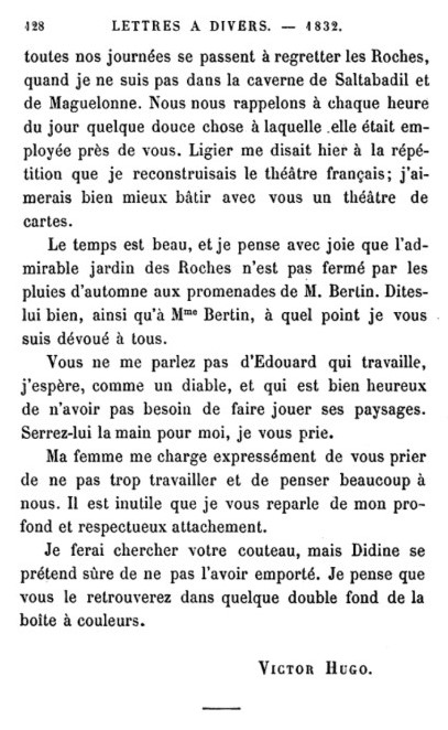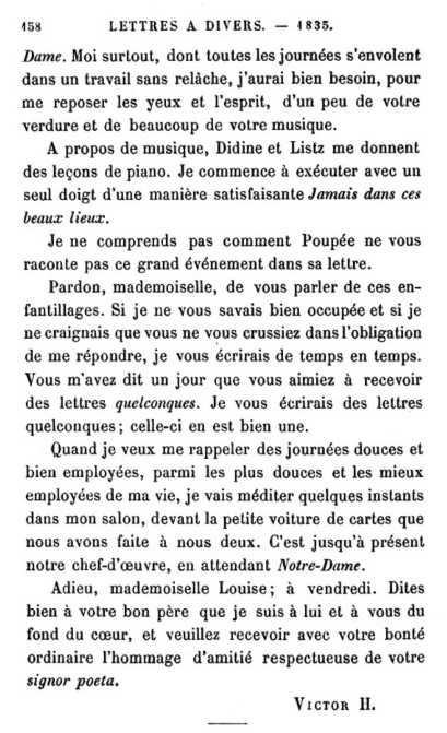 In English, roughly: 'When I want to remember the sweet and well-spent days, among the sweetest and best-spent of my life, I go and meditate for a few moments in my living-room, in front of the little voiture de cartes that we made together. It is our masterpiece so far, while we wait for Notre Dame.' At this time Louise Bertin was 30 years old. The reference to 'Notre Dame' is to her opera 'La Esmerelda' for which Victor Hugo had written the libretto, based on his novel 'The Hunchback of Notre Dame'. There are two other mentions of Hugo and Bertin building things with cards in previous letters from 1832. These are supportive of an interpretation of 'la petite voiture de cartes' as La Voiture de Cartes and so I have included them in fgull at ther foot of this page. **********